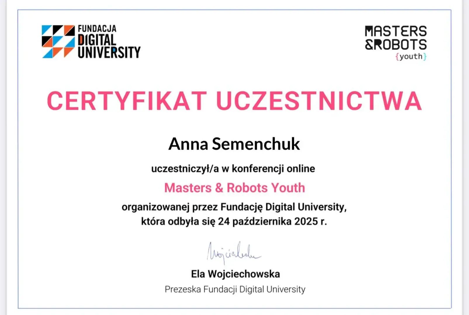 24 października 2025 r. uczniowie naszej szkoły wzięli udział w wyjątkowej konferencji online Masters & Robots Youth 2025, organizowanej przez Fundację Digital University. Wydarzenie zgromadziło młodzież z całej Polski, by wspólnie odkrywać przyszłość technologii, kompetencje jutra i ścieżki kariery w świecie cyfrowej transformacji.